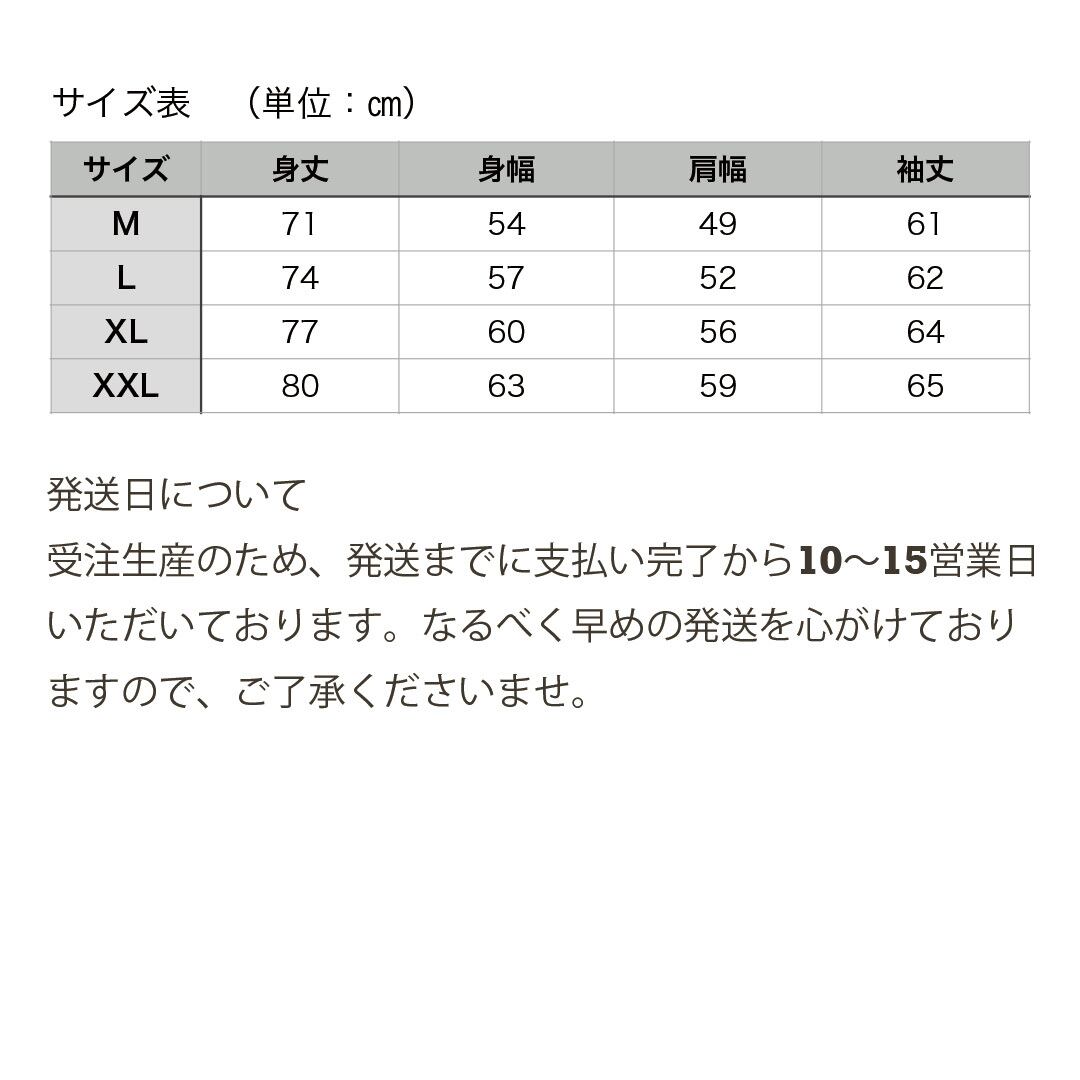 受注生産のため、支払い完了から発送までに10〜15営業日いただいております。